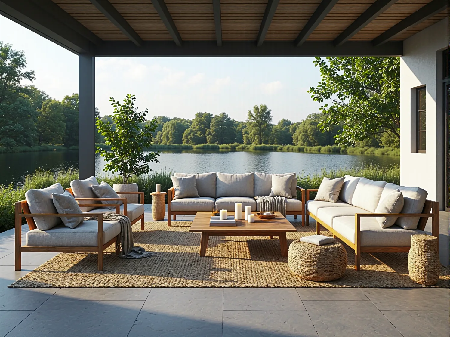 To serce ogrodowego życia. Narożniki ogrodowe lub zestawy składające się z sofy i foteli pozwalają na komfortowe goszczenie rodziny i przyjaciół. Ważne są tutaj poduszki – nad jeziorem koniecznie wybierz te wykonane z tkanin typu Sunbrella lub innych materiałów hydrofobowych, które nie chłoną wilgoci i nie blakną na słońcu.