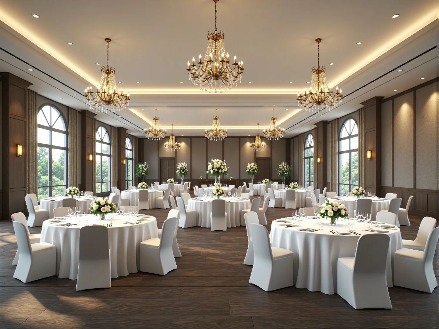 - Stoły prostokątne: Ustawione w formie podkowy, litery E lub jako długie, biesiadne stoły. Świetnie sprawdzają się w węższych salach.