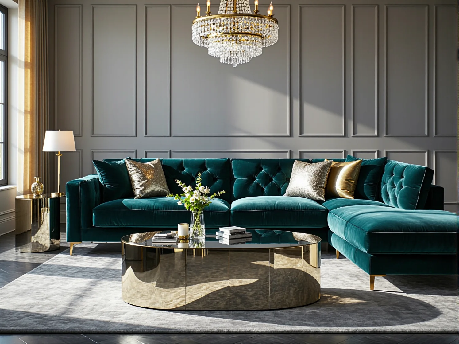 - Forma i detal: Charakterystyczne są głębokie pikowania, ozdobne przeszycia (często w kontrastującym kolorze), zaokrąglone, opływowe kształty i eleganckie podłokietniki. Nóżki mebla to biżuteria dla sofy – najczęściej wykonane z metalu w kolorze złota, srebra, miedzi lub matowej czerni.